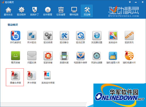 2、如果驱动精灵没有提示安装摄像头驱动或者摄像头驱动正常但摄像头不能使用的话也不用着急。因为驱动精灵还推出了一款专门针对这种问题的摄像头修复工具,在驱动精灵的百宝箱内(如下图)。