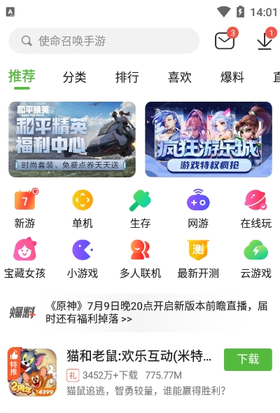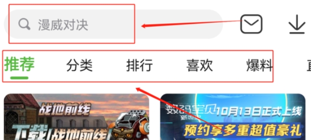 在app的主界面,会看到顶部有一个搜索框。点击这个搜索框,准备输入游戏名称。