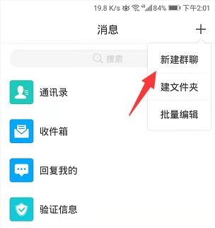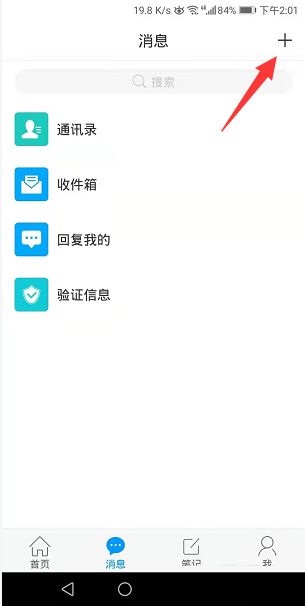 第二步:在消息页面右上角点开加号(如图所示)。