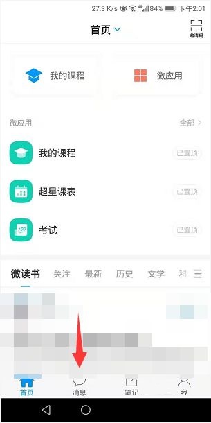 第一步:打开学习通首页,点开下方的消息(如图所示)。