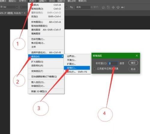 第三步:接着按住Ctrl,点击文字图层载入选区,然后点击选择→修改→收缩,选择3个像素,点击确定(如图所示)。