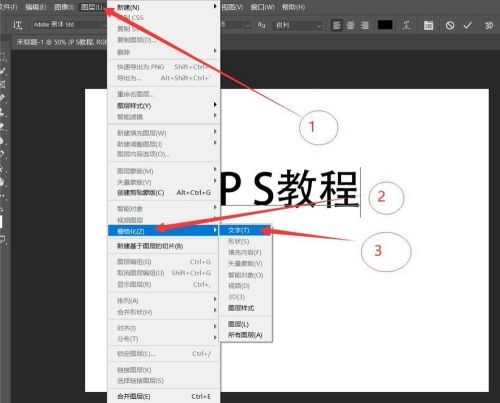 第二步:接着输入自己想要的文字,然后选择图层→栅格化→文字(如图所示)。