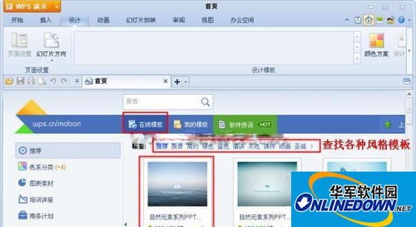 首页打开wps演示,一般情况下会直接显示“在线模板”页面,这时我们可以在此页面中进行查找,选择自己喜欢的模板,同时我们也可以在标签中搜索各种风格的模板。