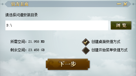 3、在同意条款后,各位仙侠可以选择问道的安装路径、以及选择是否创建桌面快捷方式和任务栏图标(同时仙侠们也要保证电脑的C盘有足够的空间,因为在安装过程中会往C盘创建缓存文件,但是请不要担心,这些缓冲文件会在安装完成后自动删除)。