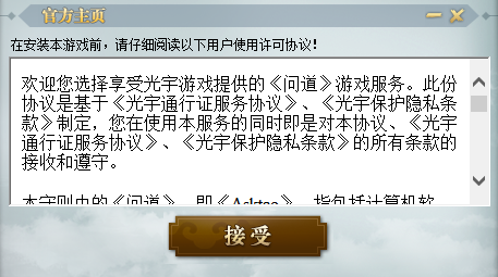 2、开始安装后,会出现条款界面,各位仙侠在阅读条款之后同意条款,代表同意问道中所列举的条款,否则就只能退出安装,与修仙世界的大门擦肩而过了。