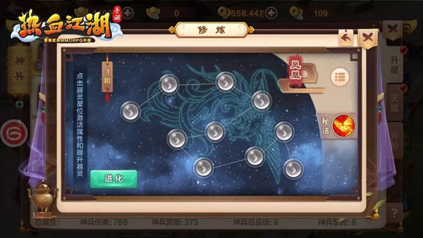 每个器灵分为若干阶,激活每一阶全部节点即可进行进化升阶,并进入下一阶的修炼,当器灵达到2阶时激活秘法,秘法永久生效,无需装备器灵。