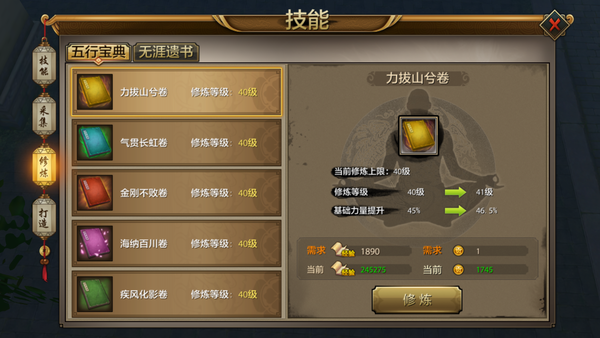 很多玩家会发现在技能的页面下面有一个“修炼”的选项,这个可以根据天机阁的等级来提升修炼的等级,也可以相应的提高我们的战力,只不过会消耗一些帮贡和经验。