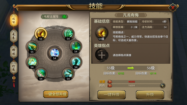 给丐帮门派的技能升级,也可以提高战力,一共有8个技能,我们要根据玩家的等级升到对应的技能上面,然后提高玩家的战力,升级技能需要消耗铜钱,也是非常容易就能做到的。