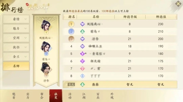弟子完成的任务进度越快,师傅就会获得更多的师德值,师德值可以提高自身的称号,让你与众不同,还可以在师德商店兑换很多丰厚的奖励。在游戏频道中还有名师的排行榜,师德值越高,在排名越靠前,也就会获得更多的奖励,受人尊重。