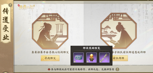 徒弟拜师以后完成养成任务、师徒组队任务等修学录,就可以获得修学点数,点数越高,获得的奖励也就越多。