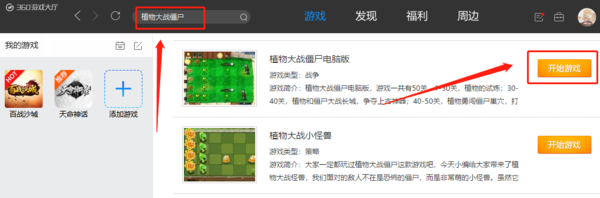 打开360游戏大厅后,先登录自己的账号,在主界面,可以根据不同的游戏类型来选择查找游戏。如果知道游戏的名称,也可以在左上角的搜索栏中输入名称来查找游戏。找到游戏后,直接点击选项栏右侧的开始游戏,就会自动跳转到游戏界面。