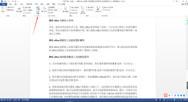 1、使用微软office的Word软件来将你的毕业论文文档打开,然后点击界面顶部上方的【引用】选项卡。