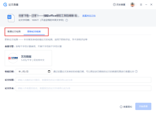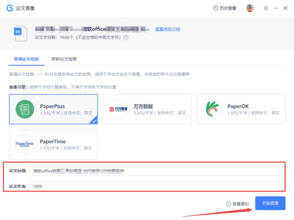 5、再接着输入好【论文标题】和【论文作者】,然后点击【开始查重】按钮,最后支付查重费用就可以开始进行论文的查重了。