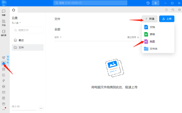 首先,我们打开钉钉,来到主界面后,在钉钉主界面左侧的模块栏中找到并点击【云盘】,以切换到钉钉的云盘界面;然后我们点击里面的【新建】,接着点击【脑图】,就能在钉钉中创建脑图文件了。