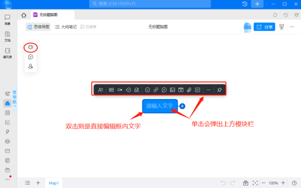 接着我们来到钉钉的脑图界面,首先会看到主标题,如果我们单击它,就可以召唤出上方的功能栏,届时我们可以对标题进行添加子节点、添加标注等操作;如果我们直接双击主标题的话,则可以对框内的内容进行编辑,根据自己需求编辑内容。另外,我们还可以在左上方【调色盘】图标上更改脑图的架构,可以将其改成单向发散、多向发散等结构。