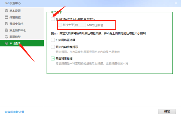 对于360安全卫士的快速扫描,由于其“扫描清理系统关键位”的特性,因此快速扫描是不带压缩包木马消杀功能的;而360安全卫士的自定义扫描则拥有消杀压缩包木马功能,且属于默认开启的。