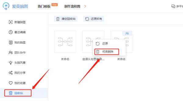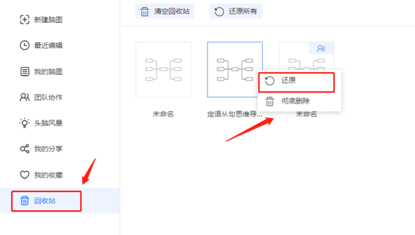 在没有彻底删除思维导图之前,如果是还存留在回收站中的思维导图仍然是可以找回的,我们在删除某个思维导图后,这些被删除的文件会停留在回收站中,我们在这里就可以对其进行恢复了,找到需要恢复的文件然后右键点击该文件,在出现的选项中选择“还原”,文件回到“我的脑图”中了。