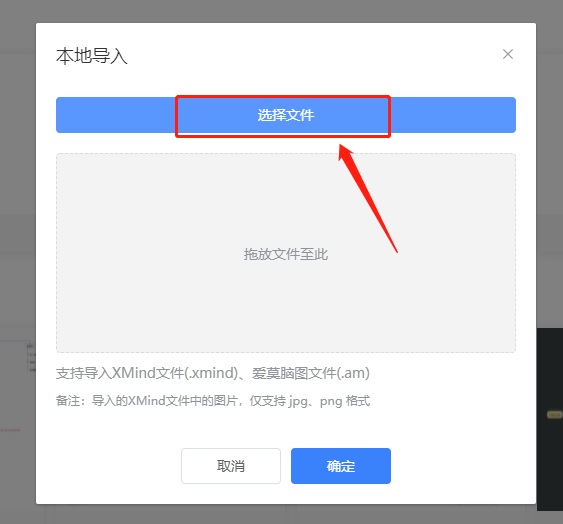 在这里点击“选择文件”,将文件添加到软件中之后,点击下面的“确定”,就可以将本地的内容导入到爱莫脑图中了。