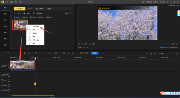 2、视频文件添加好以后,我们还是将该文件拖拽或右键选择添加到轨道选项,来将视频添加到视频轨道上。
