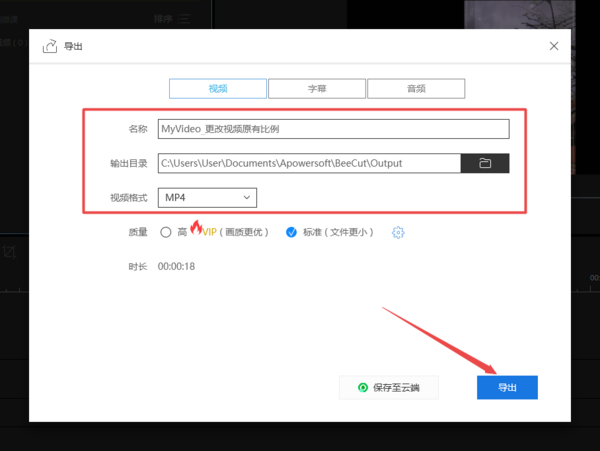 8、然后我们设置好导出视频的名称、输出目录和视频格式等参数,最后点击【导出】按钮。
