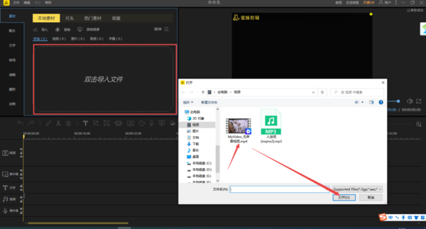 1、启动电脑上的PC版蜜蜂剪辑软件,然后双击【双击导入文件】区域,来将需要进行更改原有画面方向的视频文件添加到软件当中。