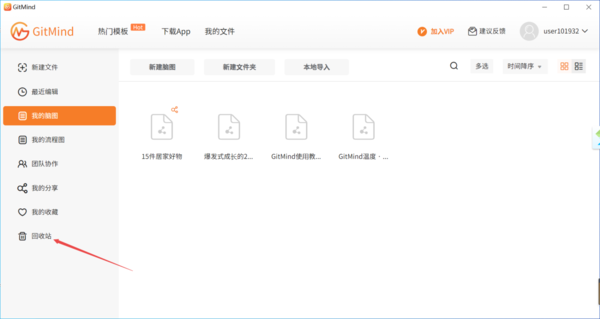 2、进入到GitMind的我的文件界面当中后,在左侧的列表中,我们就可以看到【回收站】功能了,点击它。