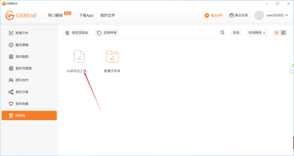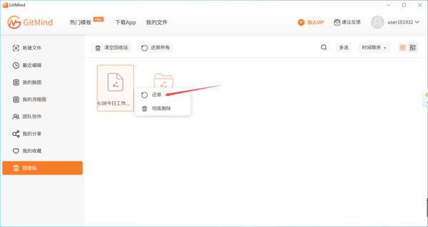 这里需要注意的是,目前并不清楚GitMind的回收站中被删除的文件能够保存多久,因此当大家发现文件不小心被删除了,一定要记得及时去回收站里找回来。