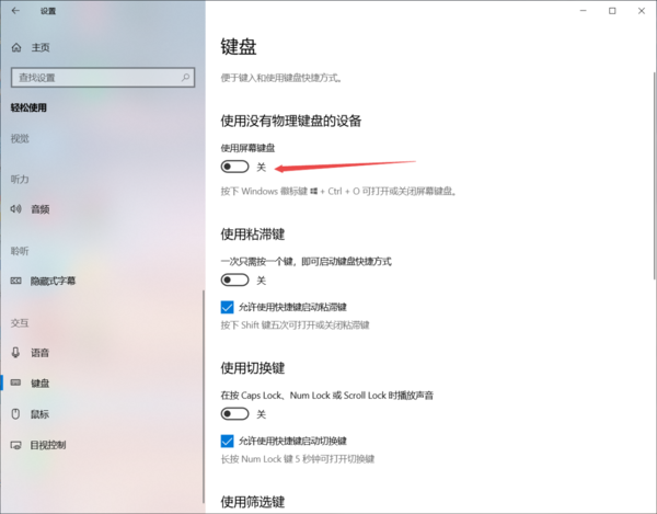 4、进入到键盘界面后,在右侧的界面顶部位置,我们找到【使用屏幕键盘】功能,并将此功能的开关滑动打开。