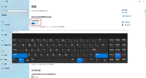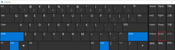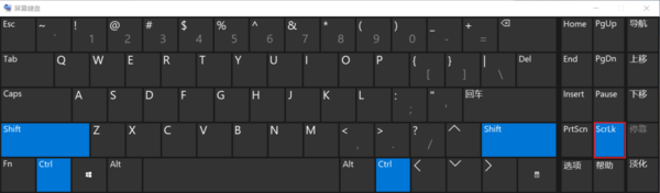 5、接着我们在电脑的屏幕上就可以看到屏幕键盘了,此时找到【ScrLk】按键也就是Scroll?Lock按键了,此时我们看到它是蓝色的状态,说明此功能就是开启的,再次点击它。