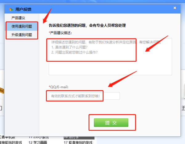 在这里我们可以在左侧选择是要对哪方面进行问题的反馈,点击之后就可以在右侧进行问题的描述,然后填写好自己的联系方式,最后点击下面的“提交”,然后等待官方的反馈回复就可以了。
