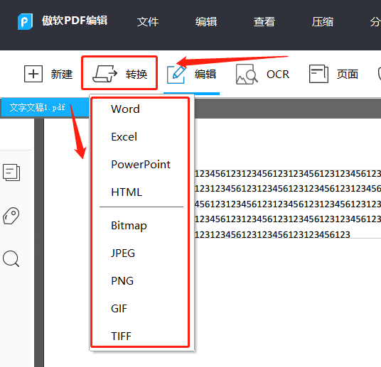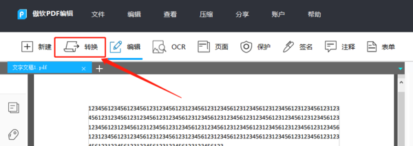 编辑好文件后也可以直接使用傲软PDF编辑来直接转换格式的,在左上方找到“转换”选项。