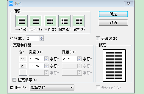第二步、在弹出的分栏面板中,我们预设为【一栏】,并在【应用于】处选择【整篇文档】,最后按【确认】即可;