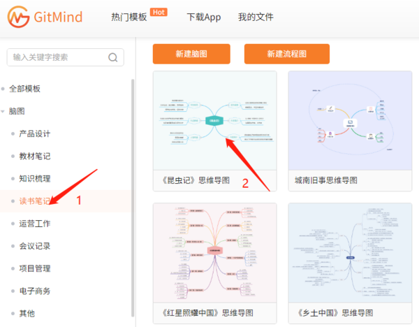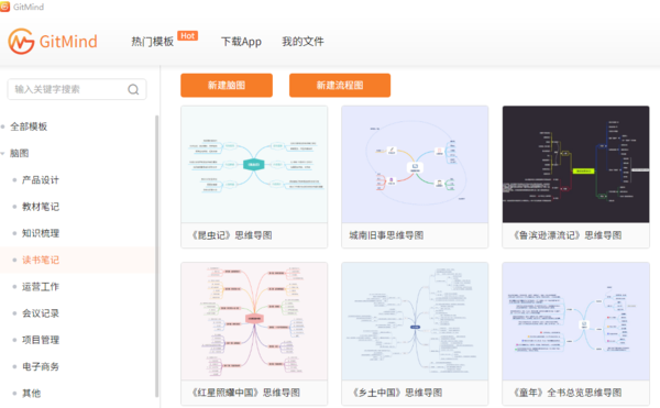 当我们来到Gitmind的模板界面,那我们该怎样使用模板呢?下面我们以读书笔记为例,展示操作流程: