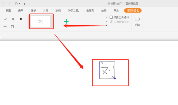 按下保存后,我们在需要添加签名的位置点击鼠标左键就可以添加上去了,之前保存过的签名也还可以再次使用,需要再次添加时,先点击上方之前添加过的签名样式,然后依然是在需要添加的位置点击鼠标左键。