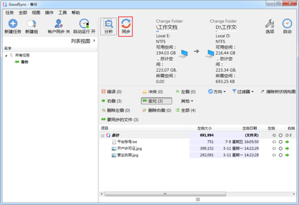 等待软件完成文件分析后,点击同步即可完成备份。