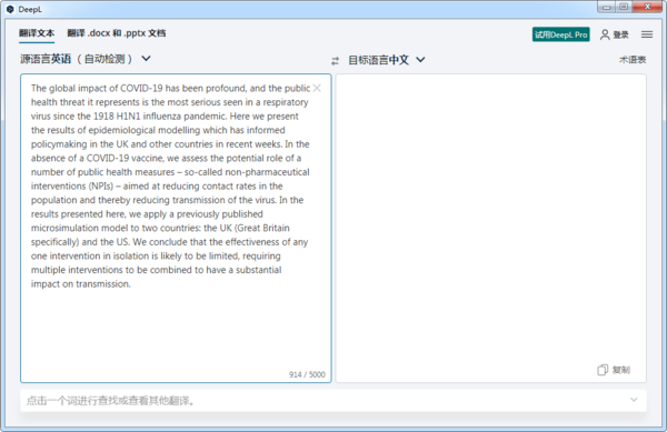 文章粘贴到软件中后,DeepL会自动检测并完成翻译。