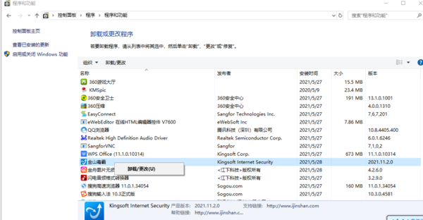 3.?在卸载程序中找到金山毒霸,然后鼠标点击右键出现卸载这样就可以了。