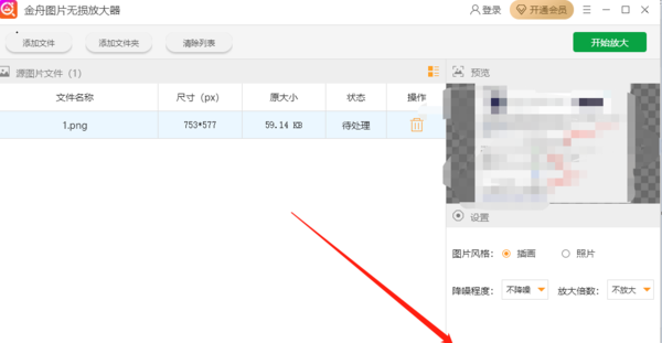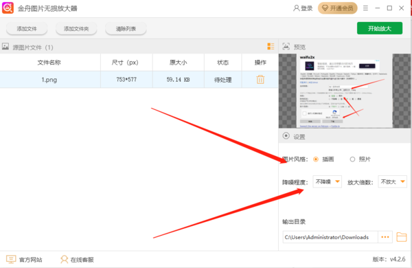 第二步、顺利上传完图片后,在软件的右下方设置图片风格、降噪程度以及放大倍数。