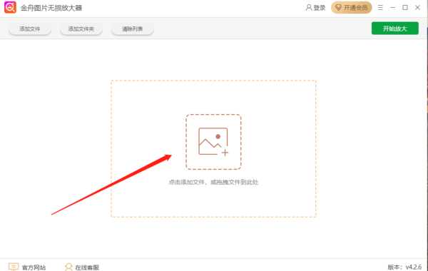 第一步,在电脑上双击打开已下载并安装好的金舟图片无损放大器,点击中间位置的大图标,把需要压缩的图片添加进来,也能够点击左上角的添加文件跟添加文件夹添加图片。