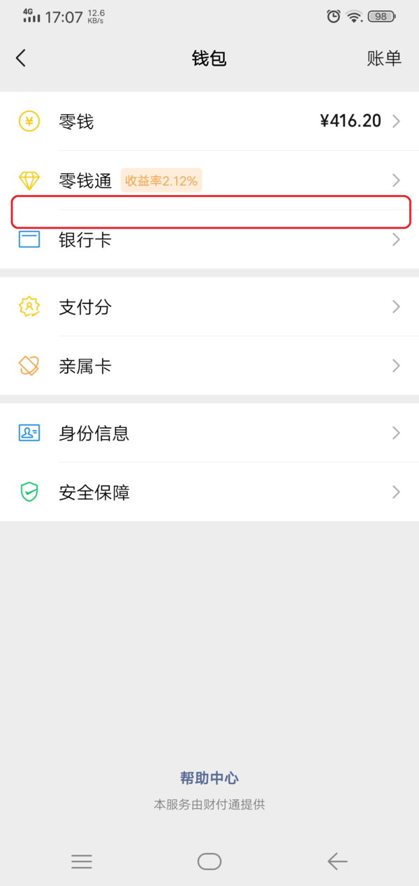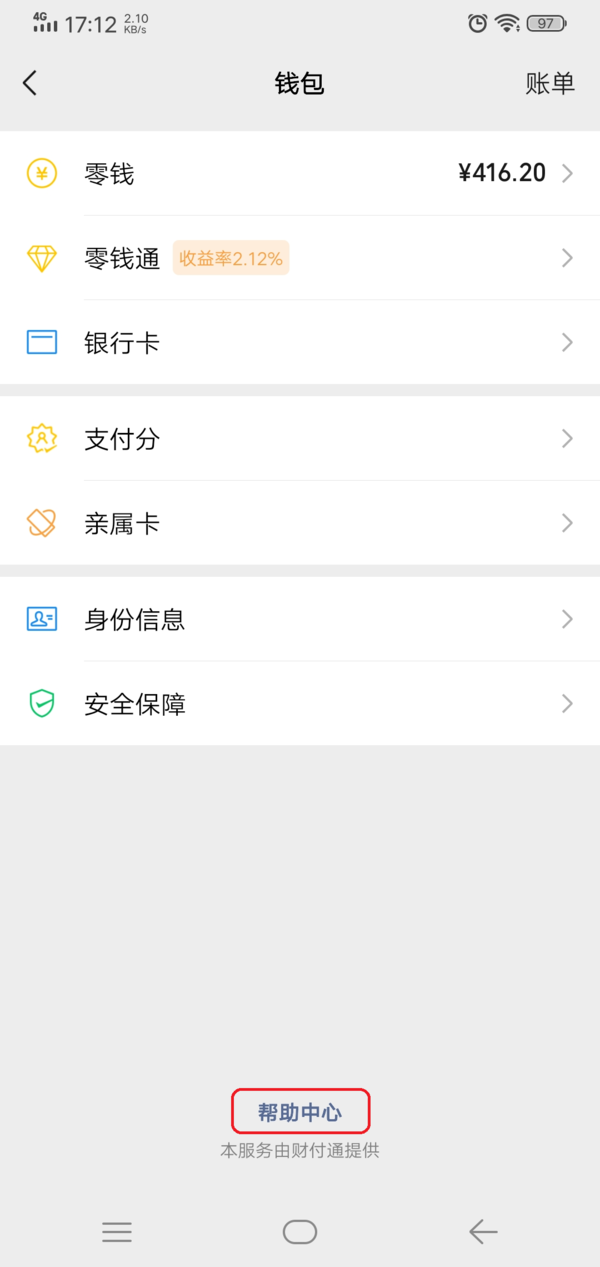 第五步,如果自己的微信版本在7.0.9版本以上,但是钱包界面中依旧没有分付的开通入口的话。此时我们在微信的钱包界面中,点击【帮助中心】选项。