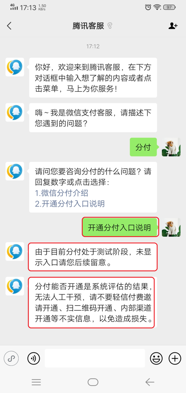 第七步,接着我们在与客服的聊天界面中输入【开通分付入口说明】的关键字,此时我们可以看到客服会回复我们【由于目前分付处于测试阶段,未显示入口请您后续留意】,以及【分付能否开通是系统评估的结果,无法人工干预,请不要轻信付费邀请开通、扫二维码开通、内部渠道开通等不实信息,以免造成损失】的消息。