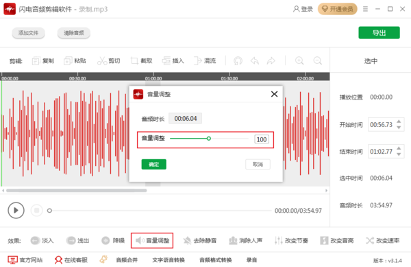 点击下方的音量调整,将选中部分的声音调整到合适大小,点击确定。