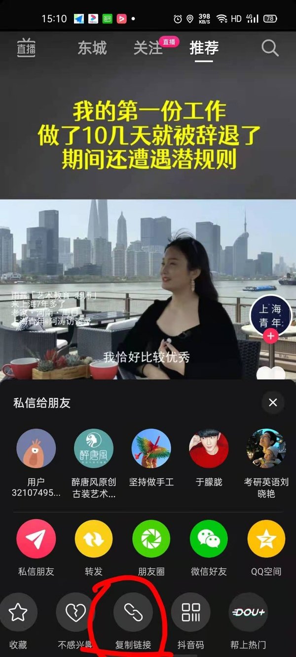 第一步,打开抖音找到想要转发的视频,点击【转发】按钮,之后选择【复制链接】。