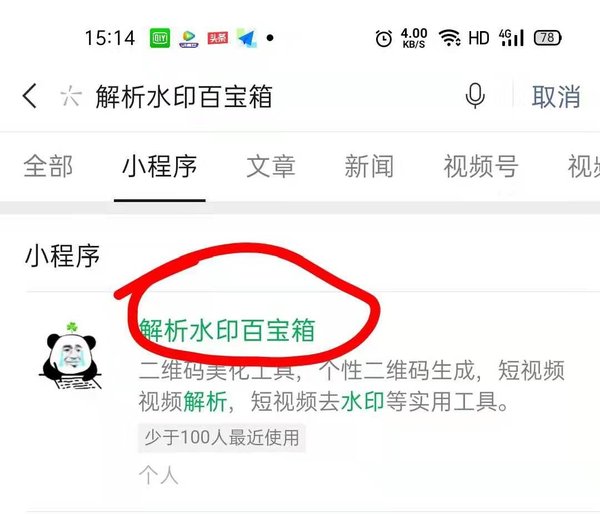 第二步,接下来打开微信,进入到搜索页面,搜索小程序【解析水印百宝箱】。