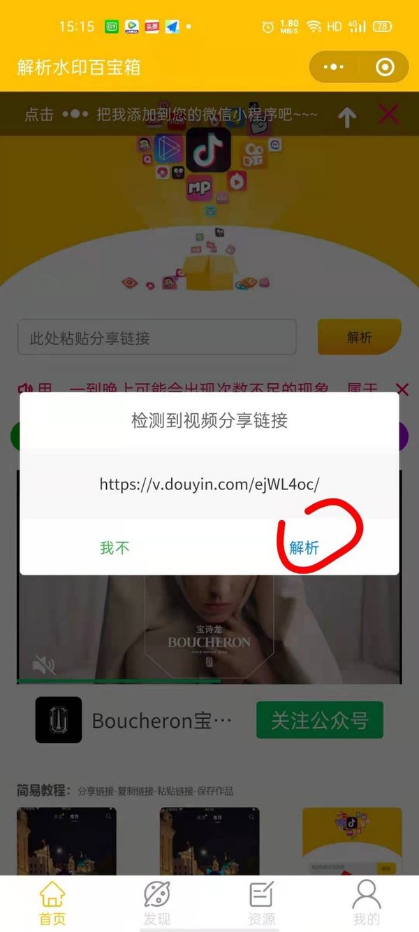 第三步,点击进入小程序之后,会有一个提示框,直接点击【解析】按钮即可。