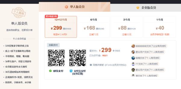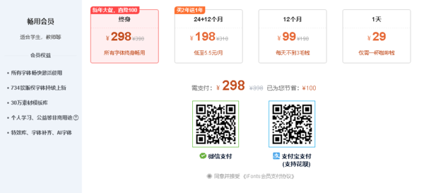 如果是购买个人商用会员的话,现在比较优惠的是买一年送一年,相当于24个月是299元,单独购买6个月需要168元。而购买畅想会员的话,字体终身使用特权现在是298元,比别的套餐划算很多。