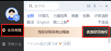 想要购买iFonts字体助手会员的小伙伴,在电脑上打开iFonts字体助手客户端之后,点击页面左侧的会员商用选项,页面刷新后,点击“优惠获取版权”按钮。