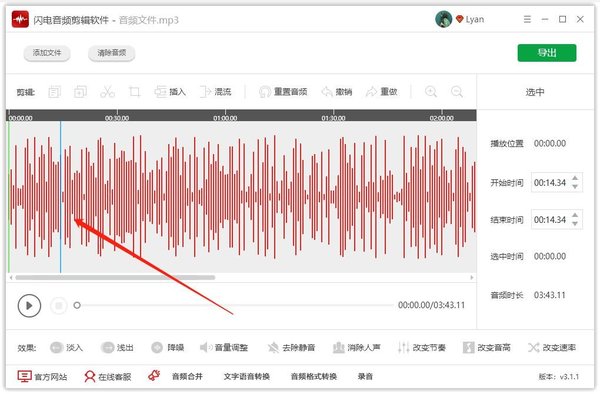 第三步、选择取音频时,需要注意的是,蓝色线为当前选中位置,绿色线为当前播放位置;选择音频时,按住鼠标左键拖动即可选中内容。