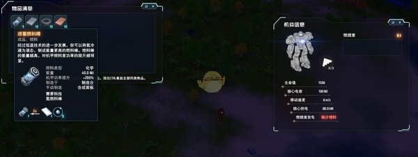 C键,机体面板,能看到机器人基本的数据,机器人行动时会不断消耗能量,把燃料拖进燃烧室,来产生更多的能量。一开始可以采集木头、植物、煤矿来获得燃料。