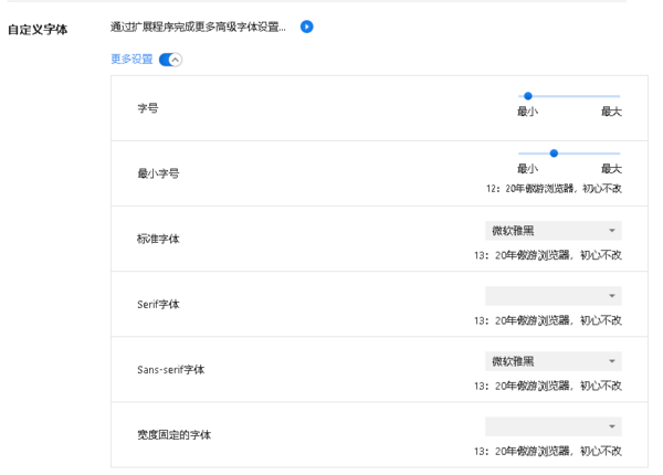 同样是在外观设置页面,点击“自定义字体”一栏中的“更多设置”键,就能打开更多高级字体设置选项。在弹出的选项窗口中,用户可以自定义设置最大最小字号、标准字体格式,数字和英文字体格式等内容。更改选择完之后,只需要关闭页面,字体就自动设置保存好了。